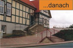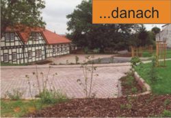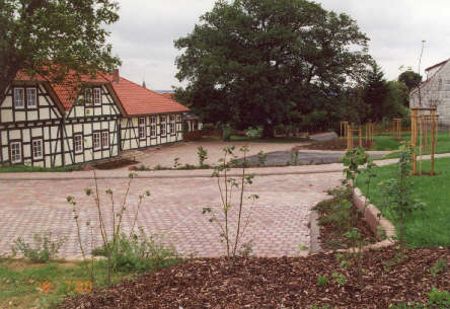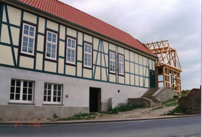 So wurden in den gestalterisch traditionell gegliederten Anbauten in Holz-Fachwerk-Konstruktionen moderne sanitäre Anlagen und Räumlichkeiten für die örtliche Feuerwehr integriert.