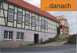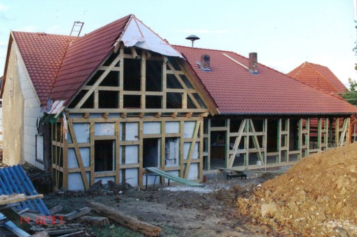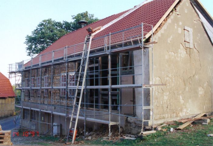 Wegen des nach Freilegung offensichtlichen starken Befalls der tragenden Fachwerkkonstruktion des Erdgeschosses wurde diese komplett erneuert und mit einer Innendämmung versehen.
