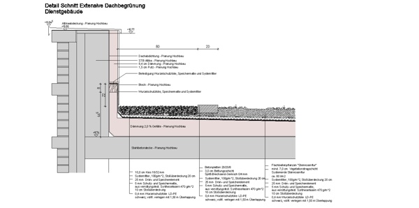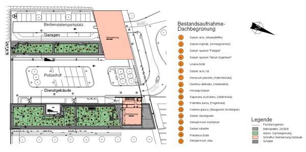 Die Planungsentscheidung viel auf eine Intensivbegrünung aus Steinrosenflur, da diese Qualität trotz ihrer geringen Aufbauhöhe und den damit verbundenen geringen statischen Auflasten dennoch ein hohes Wasserspeichervermögen im Sinne der Minimierung der Abflusswerte besitzt. Zudem lassen die hier eingesetzten Pflanzen vielfältige Gestaltungsmöglichkeiten der Teilflächen bis zur Grenze der Intensivbegrünung zu, was wegen der teilweisen Nutzung als Dachterrasse und der verstärkten Einsicht von Nachbargebäuden durchaus erwünscht war.