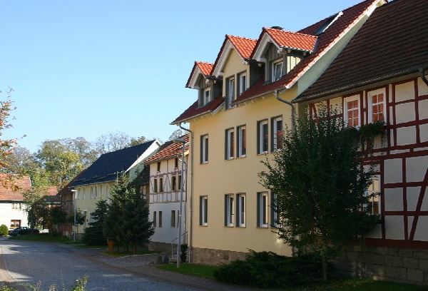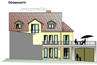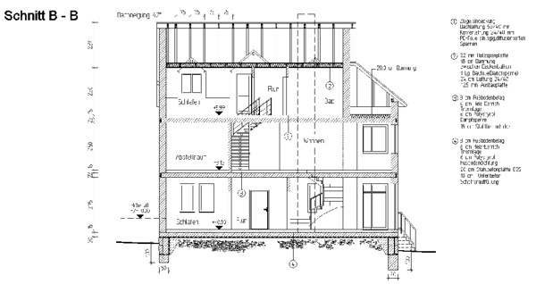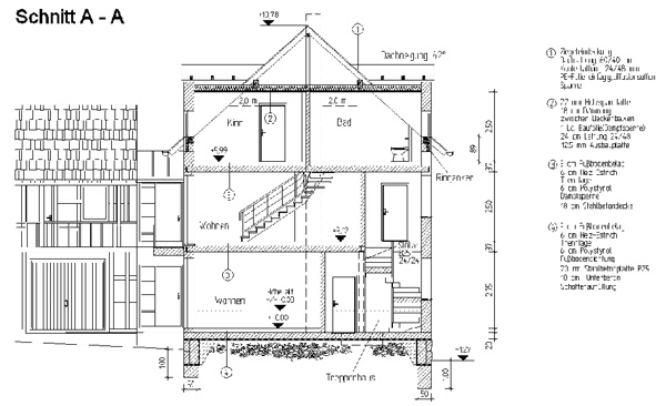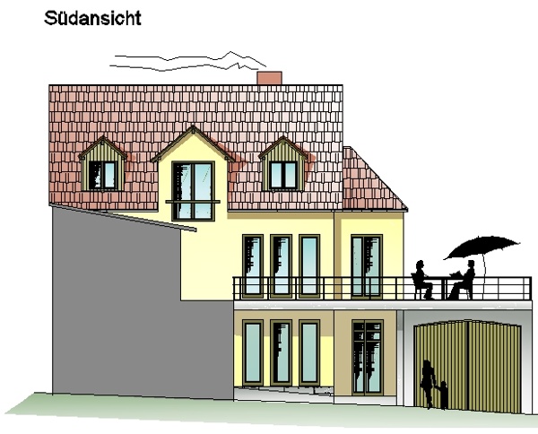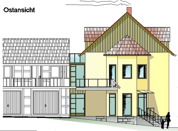 Ziel war die gestalterische Integration in die vorhandene Zeilenbebauung und die zusätzliche Schaffung eines Freisitzes. Die Verwendung moderner Baustoffe und Konstruktionen mit hohem Wärmedämmvermögen machte den Einsatz einer Erdwärmeheizung möglich.