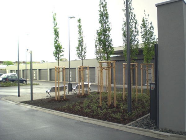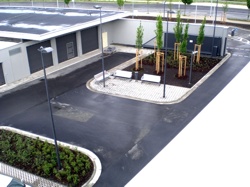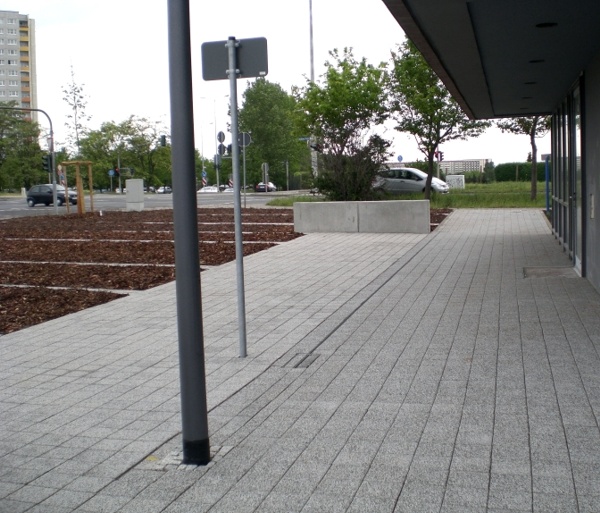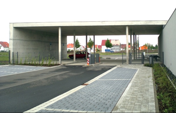 Schwerpunkt stellte die Anordnung unterirdischer Rigolen zur schadlosen Ableitung des Sickerwassers im kritischen Baugrund und die Umsetzung aller sicherheitstechnisch relevanter Forderungen des Nutzers dar. So mussten neben einer massiven Einfriedung, elektrisch betriebene Tor- und Schrankenanlagen, videoüberwachte Stellplätze und normgerechte Freitreppen- und Rampenanlagen installiert werden.